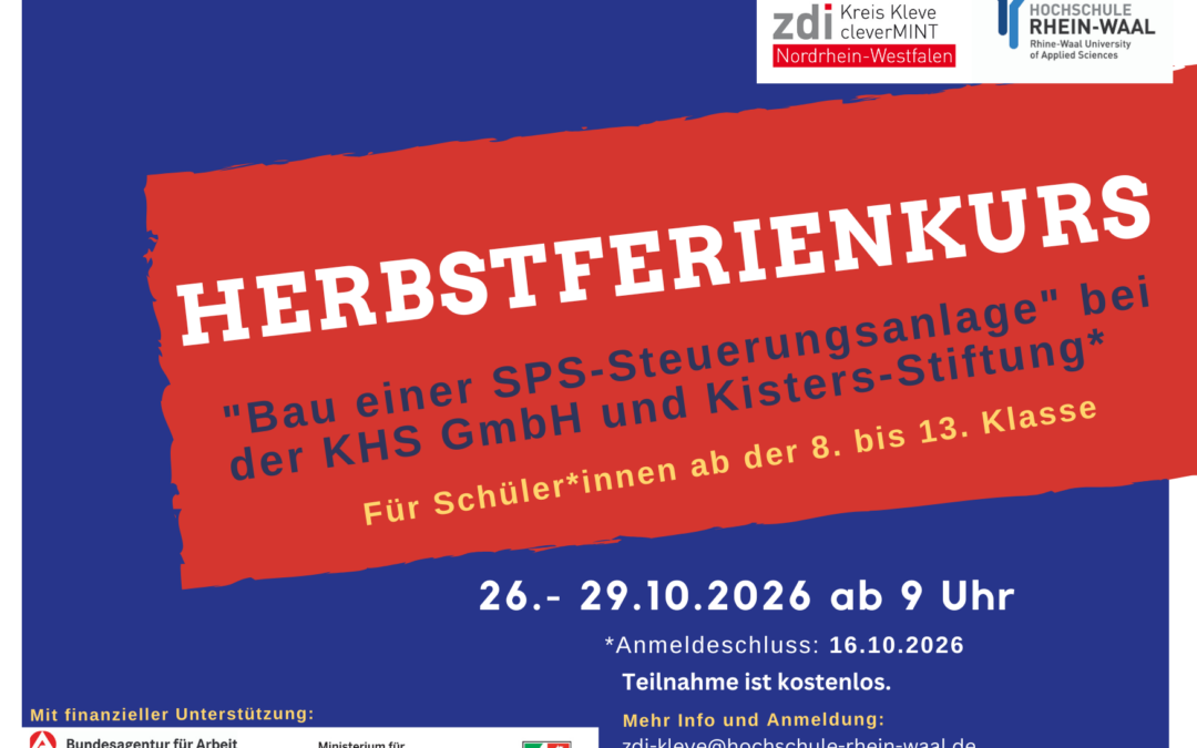 | Der Treffpunkt ist jeweils vor bzw. an der Pforte der Unternehmen. Die Teilnehmerzahl ist begrenzt und die Plätze werden nach Anmelde-datum vergeben. Anmeldeschluss ist der 16.10.2026 Dieser Kurs ist kostenlos. Anmeldung unter zdi-kleve@hochschule-rhein-waal.de |